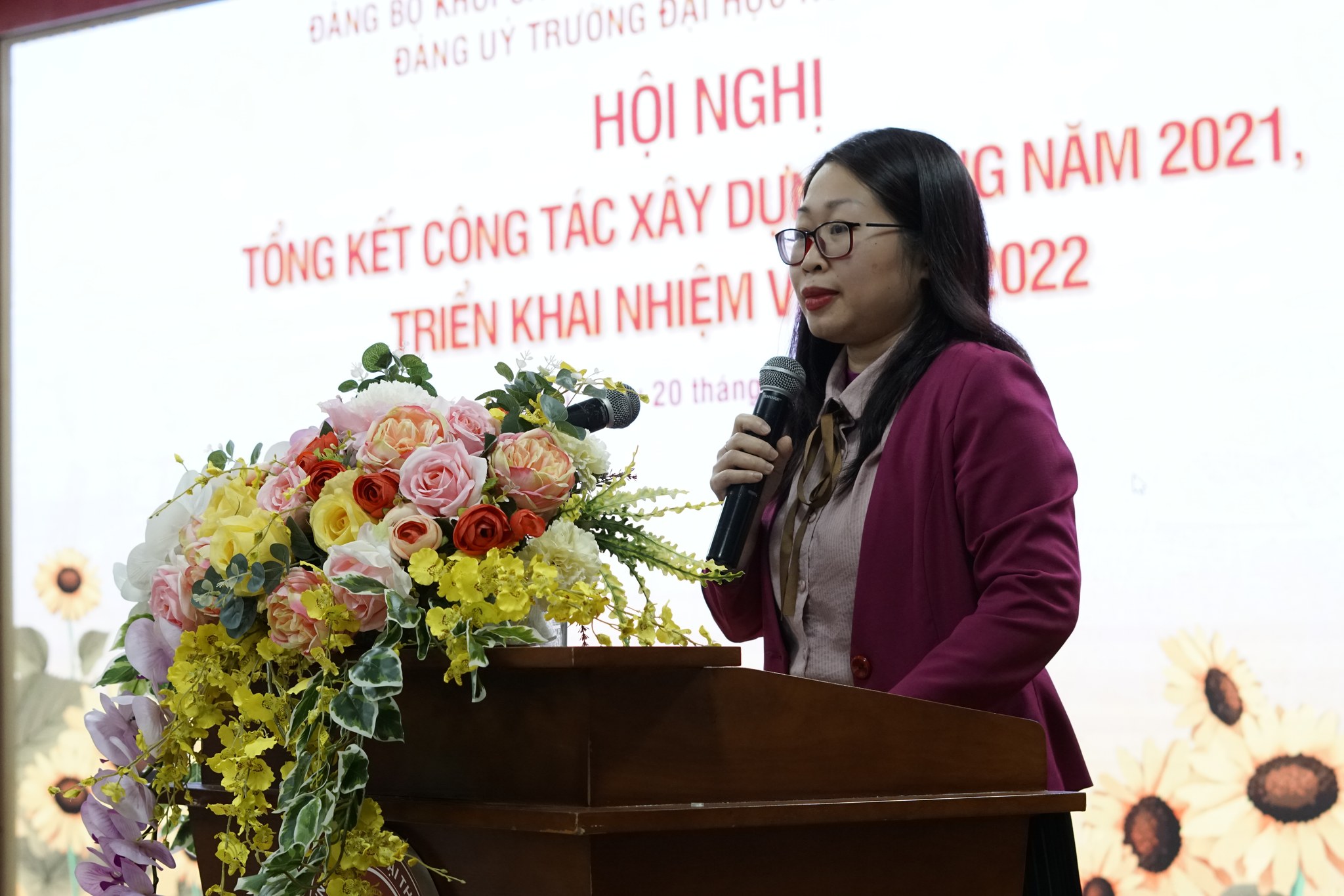 Trình bày báo cáo tổng kết công tác xây dựng Đảng năm 2021, PGS, TS Bùi Anh Tuấn đã tóm tắt những thành tựu đã đạt được của toàn Đảng bộ trong năm 2021 vừa qua ở các mặt: công tác chính trị, tư tưởng, công tác chuyên môn, công tác xây dựng Đảng, công tác kiểm tra, giám sát và thi đua, khen thưởng, công tác lãnh đạo các tổ chức đoàn thể. Theo đó, trong năm 2021 vừa qua, tình hình dịch bệnh Covid 19 tiếp tục diễn biến phức tạp gây tác động không nhỏ tới mọi mặt công tác của Nhà trường, tuy nhiên, trong khó khăn nhưng Đảng bộ Nhà trường đã lãnh đạo, chỉ đạo sát sao mọi mặt công tác, biến thách thức thành cơ hội, hoàn thành thắng lợi nhiệm vụ năm học 2020 - 2021. Báo cáo cũng đã chỉ ra những điểm hạn chế trong công tác lãnh đạo, chỉ đạo của Đảng ủy và đề ra phương hướng, nhiệm vụ trọng tâm của Đảng bộ trường trong năm 2022 tới nhằm phát huy những điểm mạnh, những thành tựu đã đạt được trong năm vừa qua và biện pháp khắc phục những hạn chế còn tồn tại. Tại Hội nghị, đồng chí Bí thư Đảng ủy đã gửi lời cảm ơn tới toàn thể các đồng chí Đảng viên trong toàn Đảng bộ vì đã cùng nhau đoàn kết, quyết tâm, phát huy dân chủ cùng tinh thần sáng tạo vượt khó để hoàn thành xuất sắc nhiệm vụ năm 2021. Nhân dịp Xuân mới Nhâm Dần đang tới gần, đồng chí Bí thư Đảng ủy gửi lời chúc sức khỏe, bình an, hạnh phúc và thành công tới toàn thể các đồng chí Đảng viên đồng thời bày tỏ kỳ vọng vào một năm mới với nhiều thời cơ mới, thắng lợi mới.
