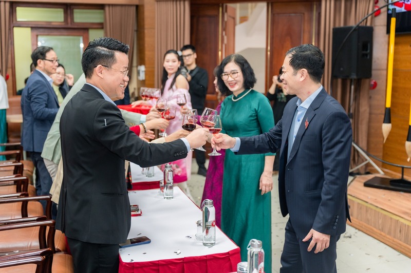 Trong không khí tươi vui chào đón Xuân mới, các thầy cô trong Tập thể lãnh đạo Nhà trường đã gửi những lời chúc đầy ý nghĩa tới các thầy cô cán bộ viên chức Nhà trường cũng như cùng cả Hội trường nâng ly tượng trưng chúc mừng năm mới, gửi gắm những tình cảm, chia sẻ niềm tự hào cũng như thể hiện sự đồng lòng, quyết tâm đạt được những mục tiêu trong chiến lược phát triển đã đề ra.