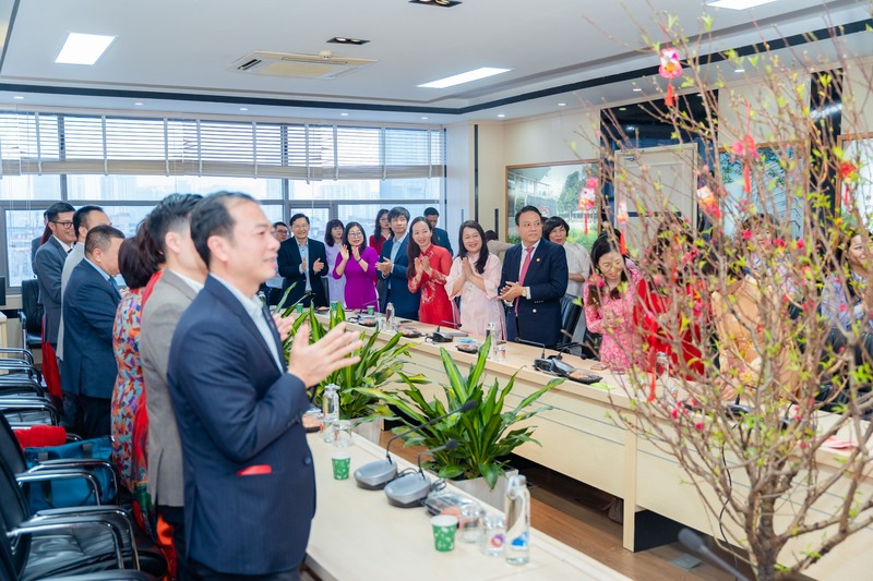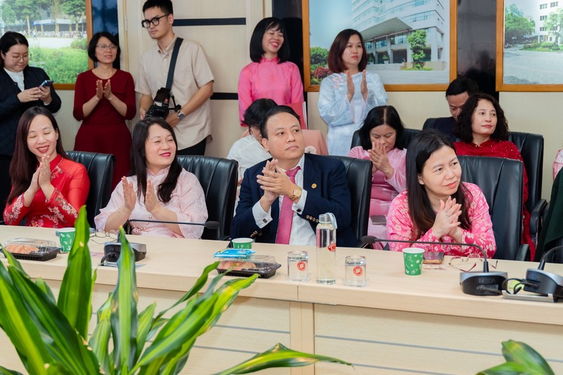 Đón tiếp Đoàn công tác, về phía Nhà trường có PGS, TS Phạm Thu Hương – Bí thư Đảng uỷ, Hiệu trưởng; PGS, TS Lê Thị Thu Thủy – Phó Bí thư Đảng uỷ, Chủ tịch Hội đồng Khoa học và Đào tạo; PGS, TS Đào Ngọc Tiến – Thường vụ Đảng uỷ, Phó Hiệu trưởng; PGS, TS Vũ Thị Hiền – Đảng uỷ viên, Phó Hiệu trưởng; TS Phùng Mạnh Hùng – Chủ tịch Công đoàn Trường, Trưởng Phòng Quản lý Dự án; ThS Đoàn Anh Tuấn – Bí thư Đoàn Thanh niên; ThS Lê Hoàng Liên – Trưởng phòng Hành chính – Tổng hợp; cùng đại diện lãnh đạo các đơn vị trong Trường.